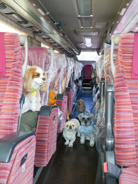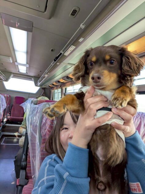 それぞれにリラックスした様子で、飼い主さんにもたれたり、コットの中で丸くなったり、思い思いにバス旅を楽しんでいるように見えました。